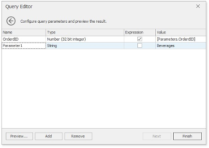 Value - Specifies the parameter's value. If the Expression check box is checked, you can invoke the Expression Editor dialog to specify the required expression or select an existing dashboard parameter to pass to the SQL query.
